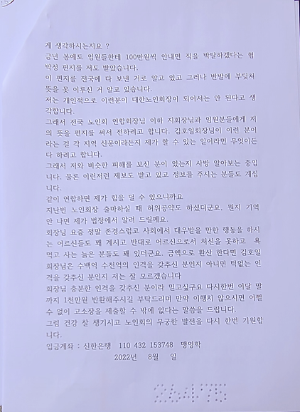 [사진5] 2022년 4월14일 대한노인회 회장 겸 헤인시대 발행인이 혜인신문 신문 구독 및 발전기금 납부를 독촉하는 서신 사본