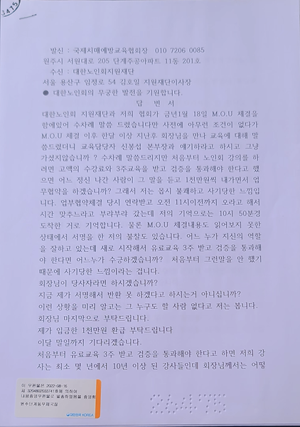 수차례 말씀드리지만 처음부터 ‘대한노인회 강의를 하려면 수강료를 내고 3주교육을 받고 검증을 통과해야한다’고 미리 말 했으면 어느 정신 나간 사람이 그 말을 듣고 1천만원씩 내가면서 업무협약을 하겠습니까?